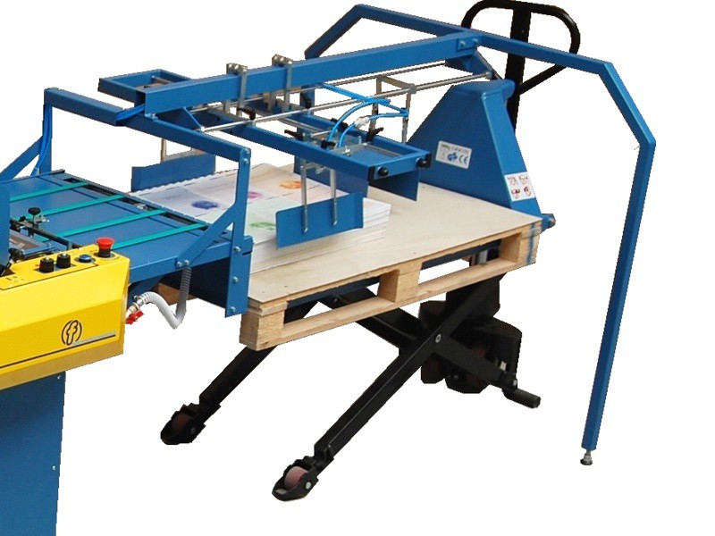 Simplier version of Pallet Stacker. The pallet is placed on scissors hydraulic forklift. Movement down is controller by machine. Movement up have to be dony by operator manually pumping with the lift. Pile of paper is made by pneumatic back and side stops. Capacity is 70 cm of paper. One pallet included.