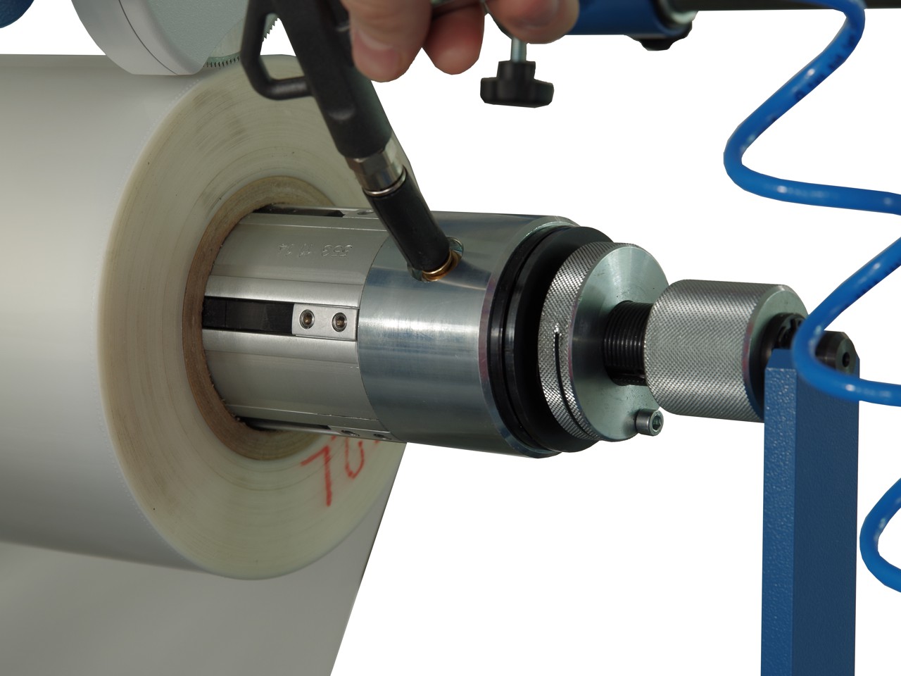 Standard film holder is replaced with air shaft for quick, tool-less film installation. Only available together with pneumatic separation option.